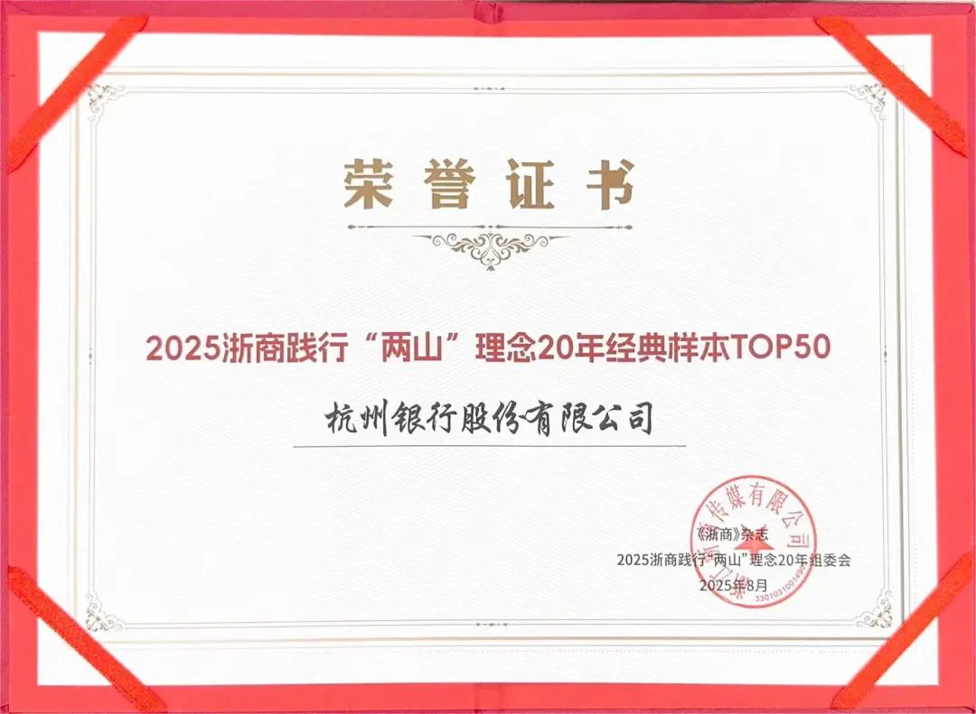 近日,在由《浙商》杂志、世界浙商客户端、浙商智库ESG研究中心、《浙商》全国理事会联合主办的“2025浙商践行‘两山’理念20周年论道”活动上,杭州银行(600926)凭借在绿色金融领域的积极实践,成功入选“2025浙商践行‘两山’理念20周年经典样本”。